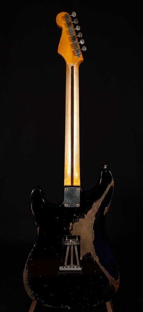 Here we have a real “wild card”: a Wildcaster in Black over Purple/Blue Cameleon. This guitar is not for traditionalists. Although the upper layer of paint is black, the mind may refuse to recognize a black Strat, because the worn areas show a paint that changes between purple and blue depending on the light. Aging isn’t exactly subtle, that’s something other people should do. Cracks in the finish, dings & dongs and massive signs of wear wherever you look. As always, the look, feel and playability form a perfect unit, down to the last detail. This time, a look at the scale shows us 3372g, not a lightweight. The alder body still vibrates extremely resonantly.